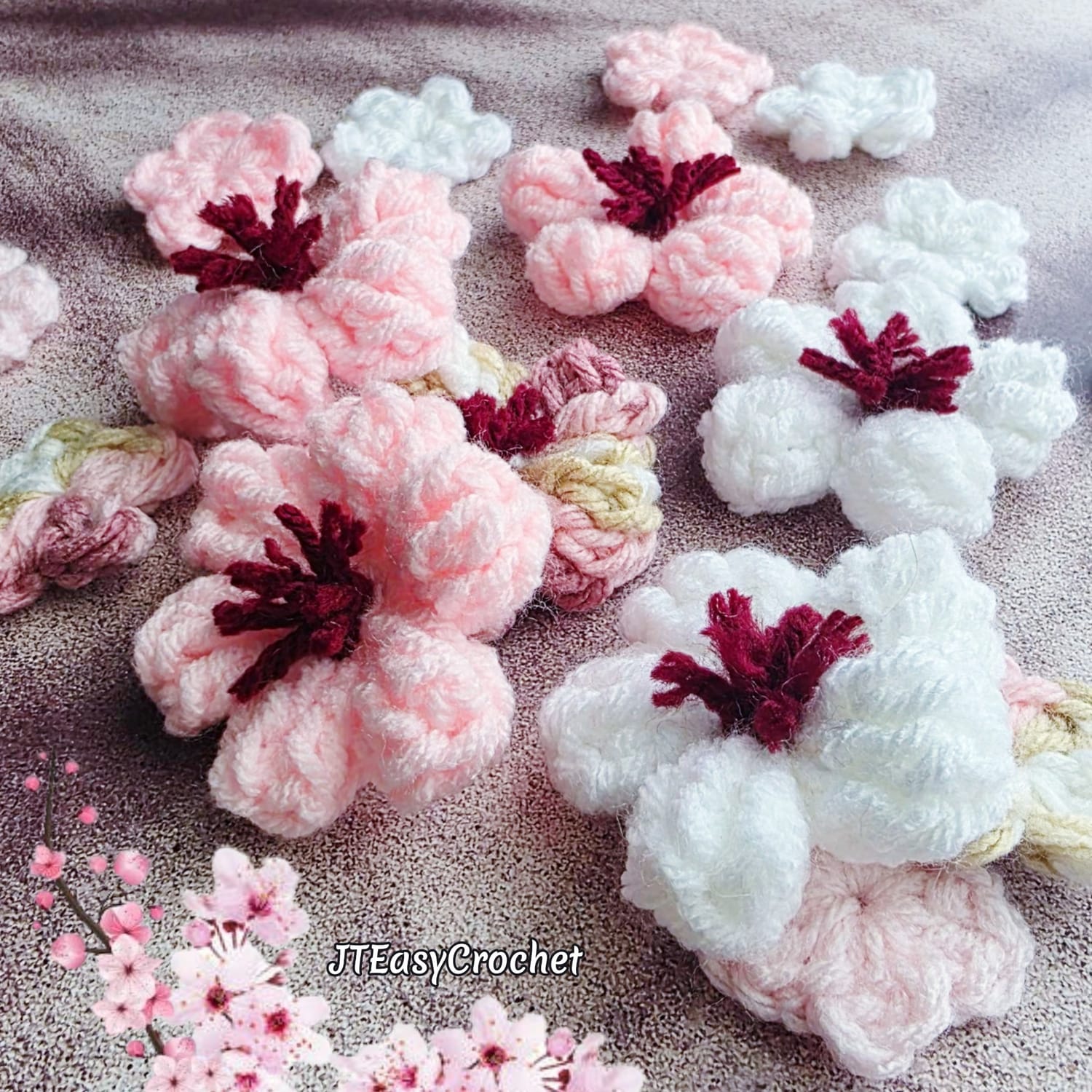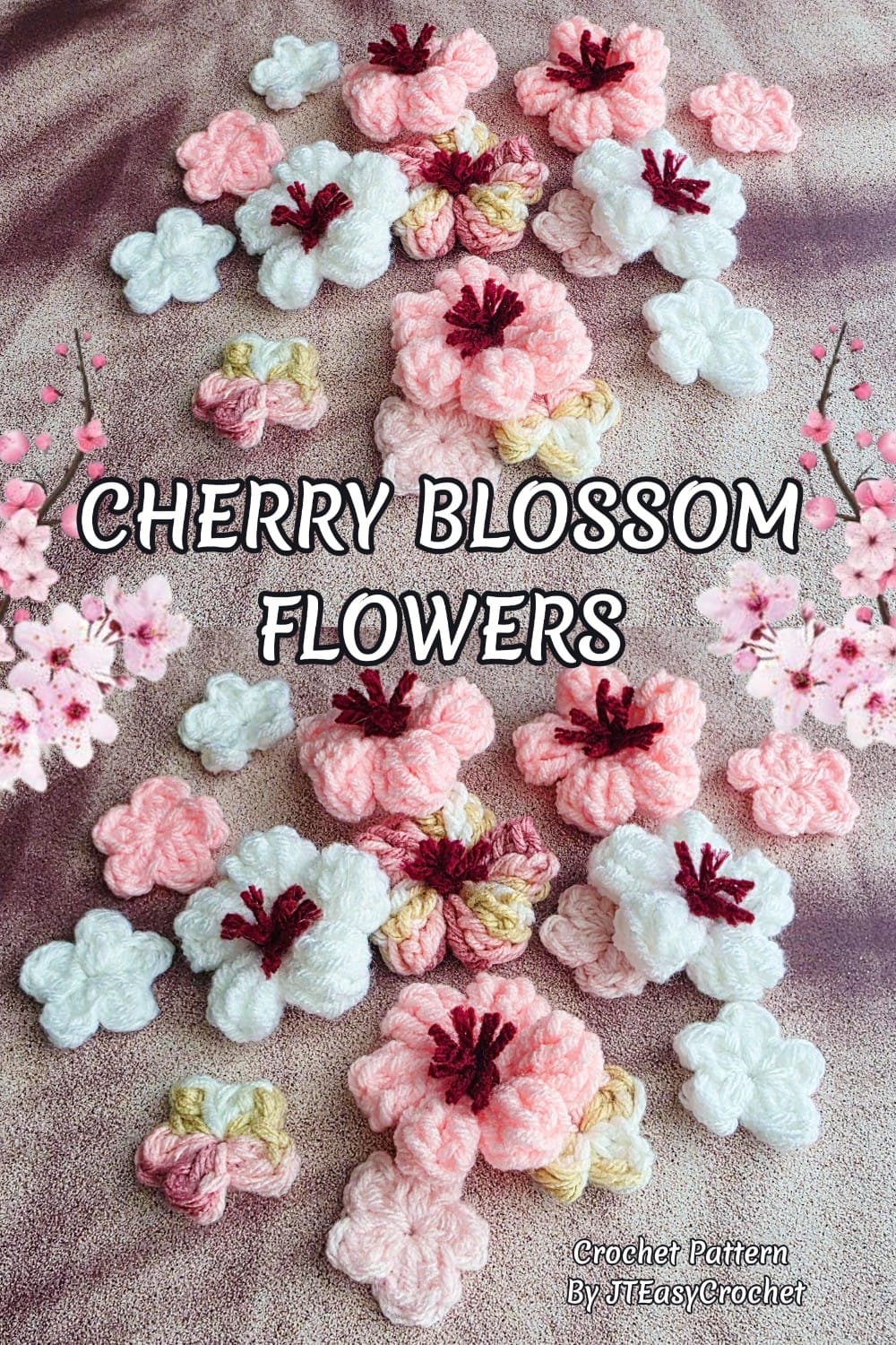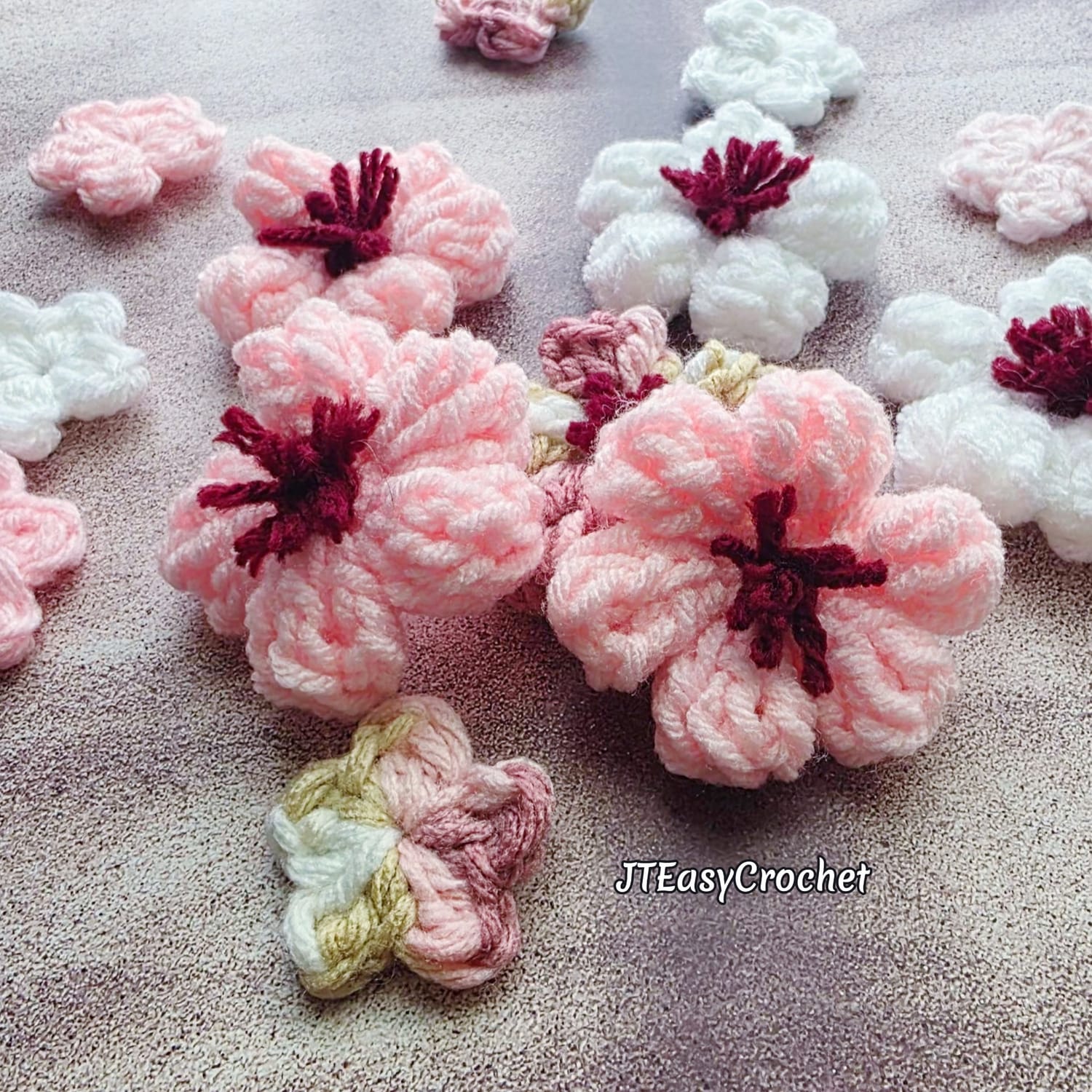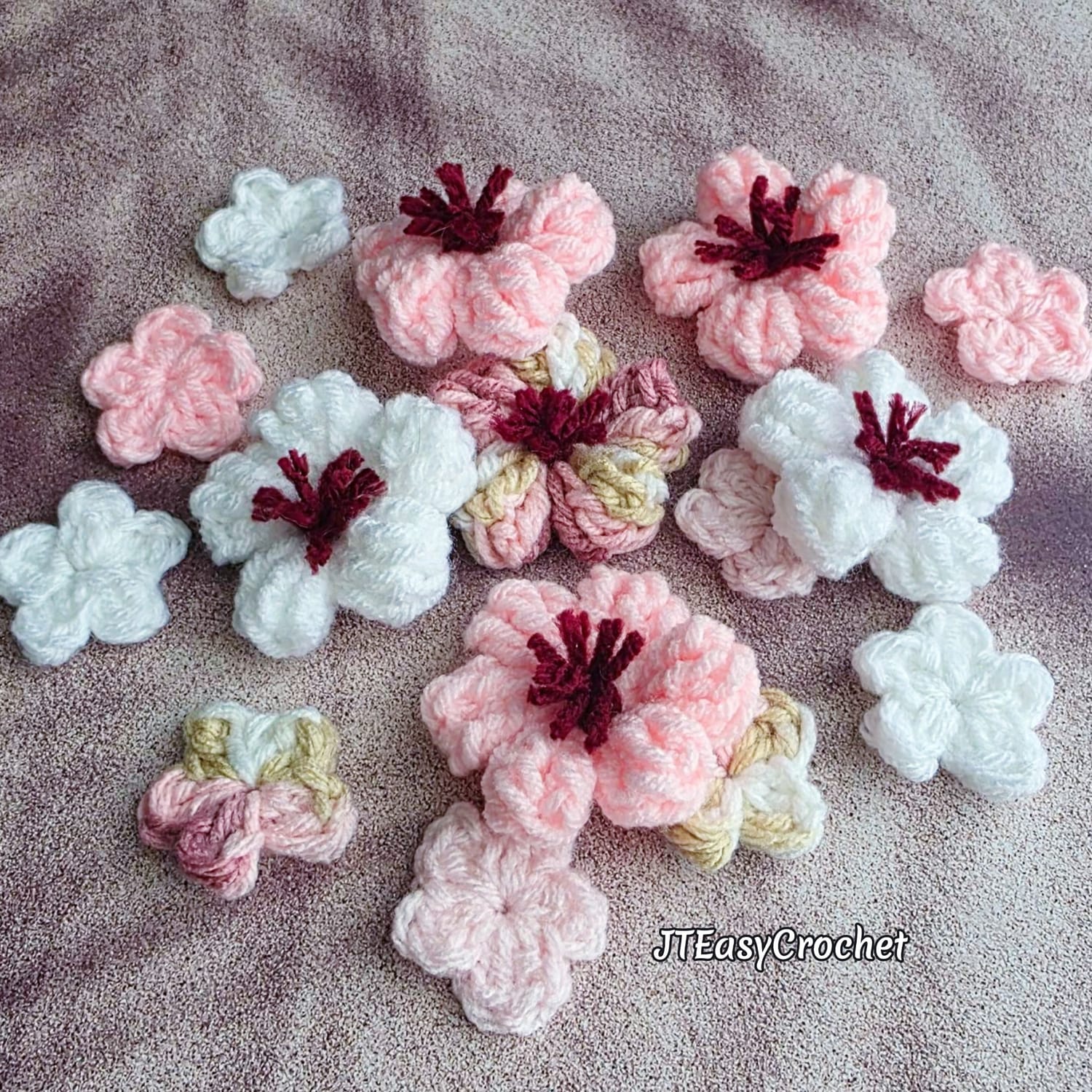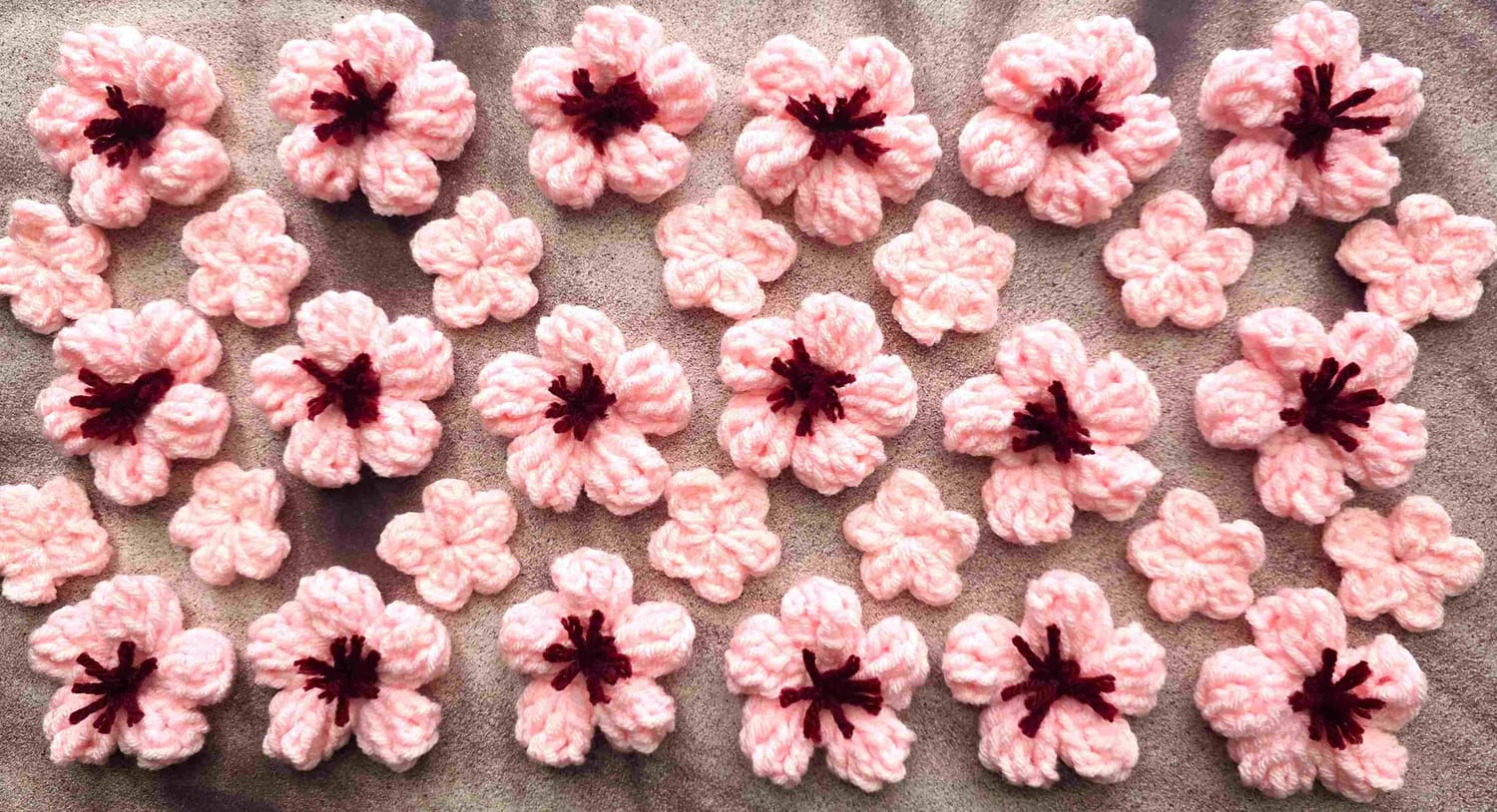 These simple cherry blossom applique patterns create a delicate, five-petaled Sakura flower in two different sizes. Both are perfect for adding a touch of spring to crochet projects or to handmade gifts.