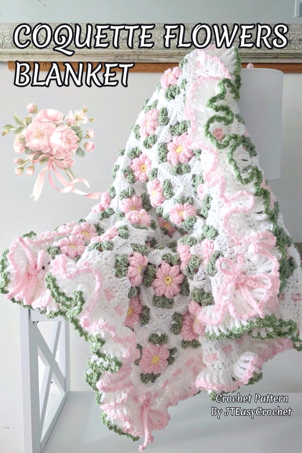 This vintage inspired, romantic and femimine coquette aesthetic crochet blanket is all flowers, frills, ribbons and bows in pastel tones.
