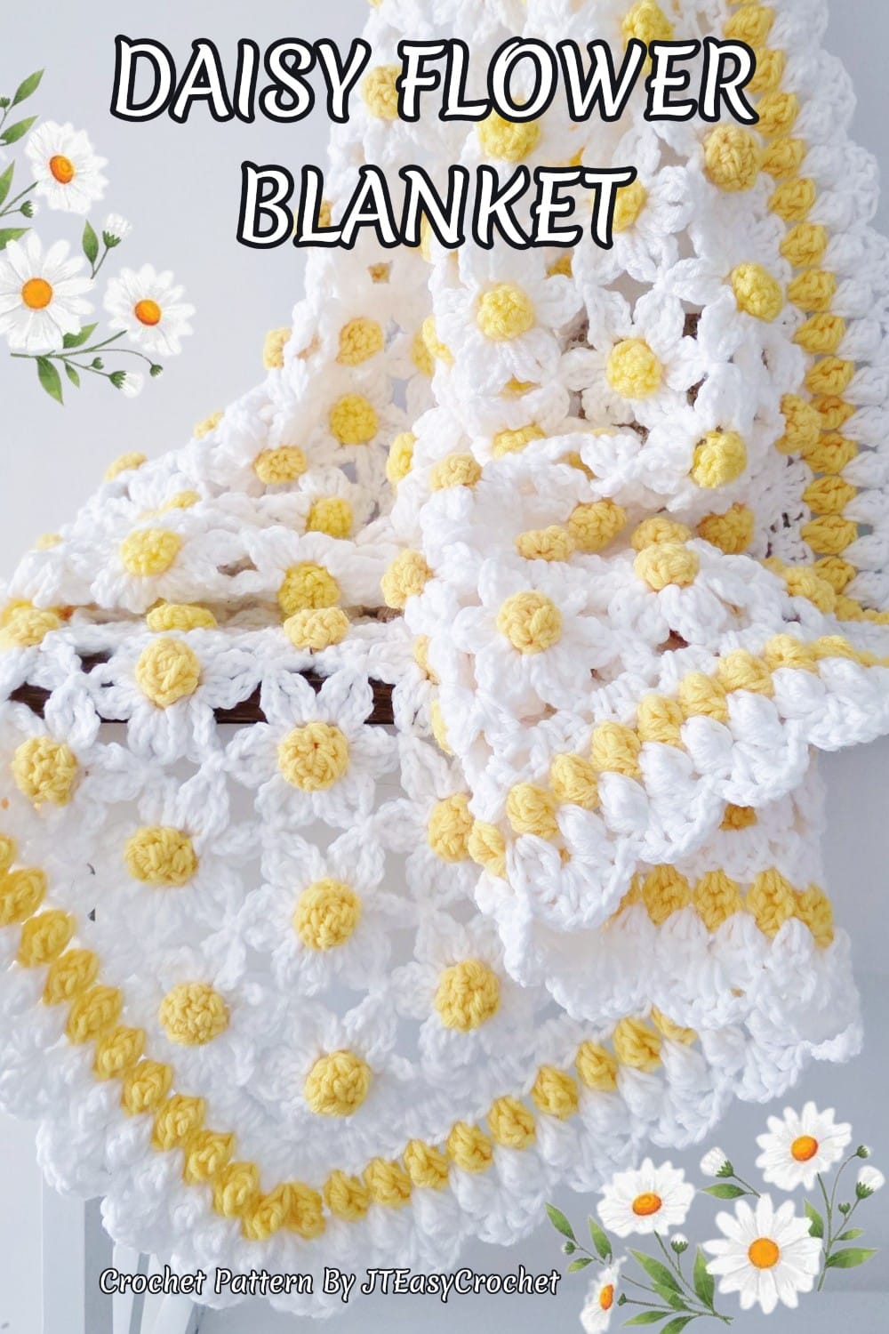 Daisy flower motifs with puffy centers are joined one by one as you go into a beautiful lacy blanket.