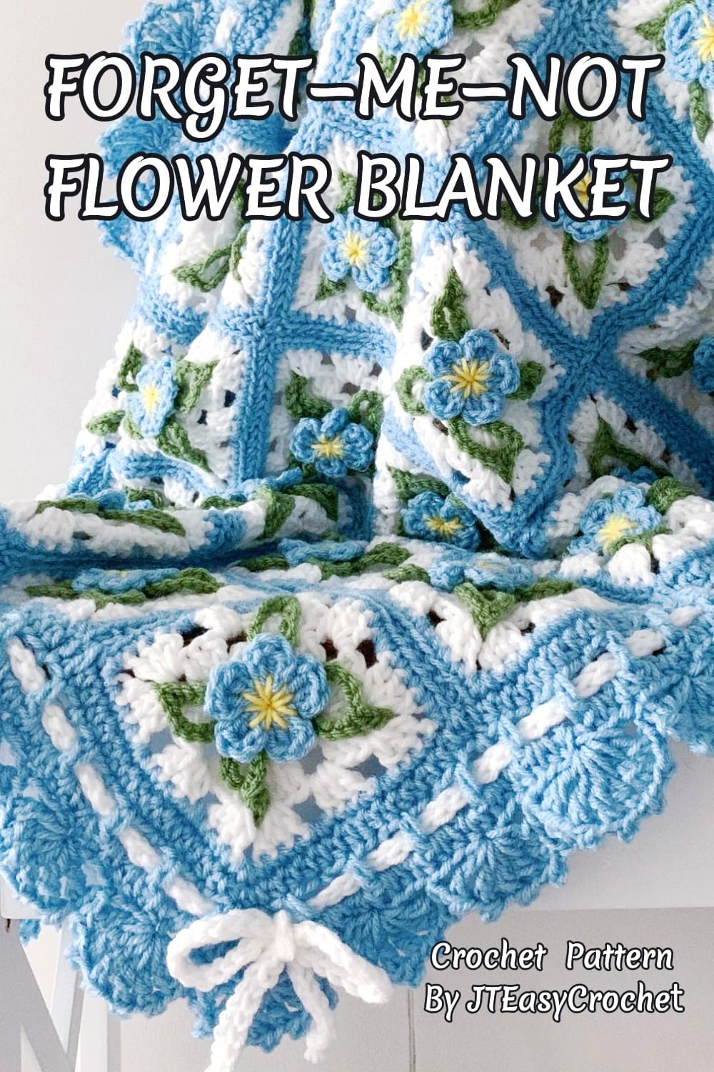 FORGET-ME-NOTS BLANKET #324: Pretty flowers, lacy border, cute ties with bows give this blanket a Victorian heirloom vibe.